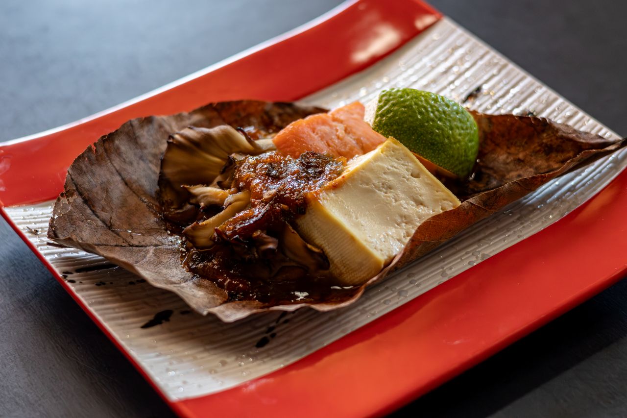 能登の銘柄牛を陶板焼きに。秋の風情を感じる月見仕立てです。