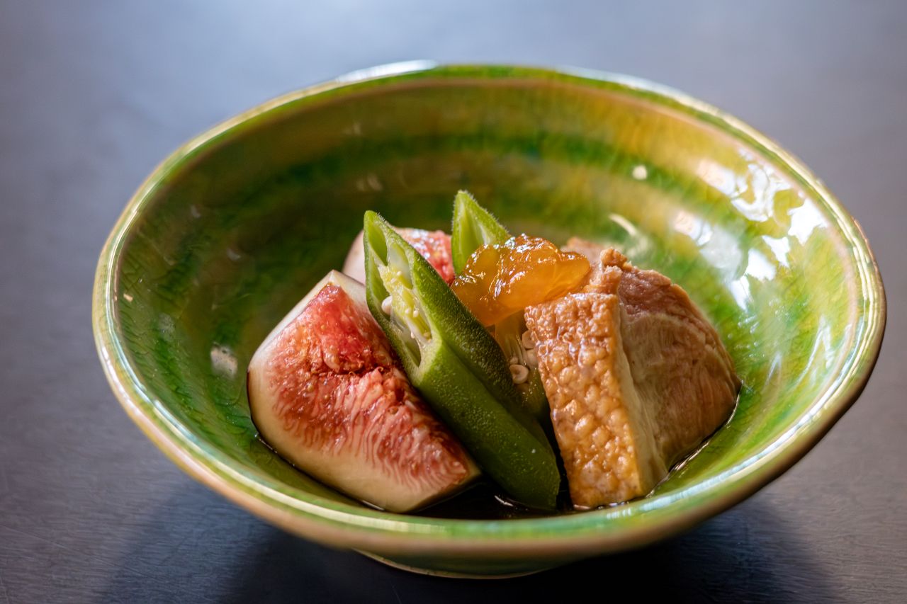 ■いちぢくと鴨ロースの煮物、オクラ、アプリコットのソース