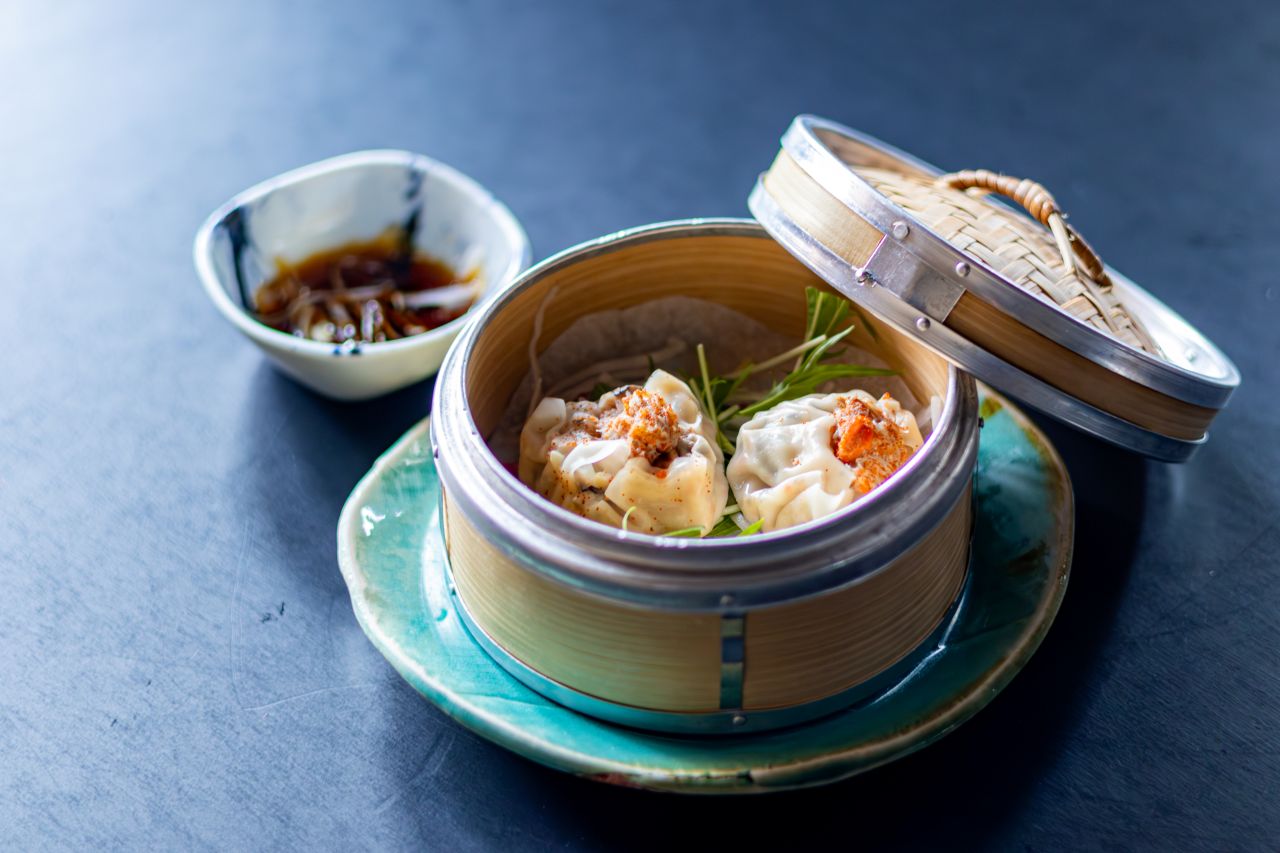 醍庵の名物。香箱蟹をつかった蟹シュウマイ。かに身だけでなく、内子も使って蟹の風味を楽しめます。
