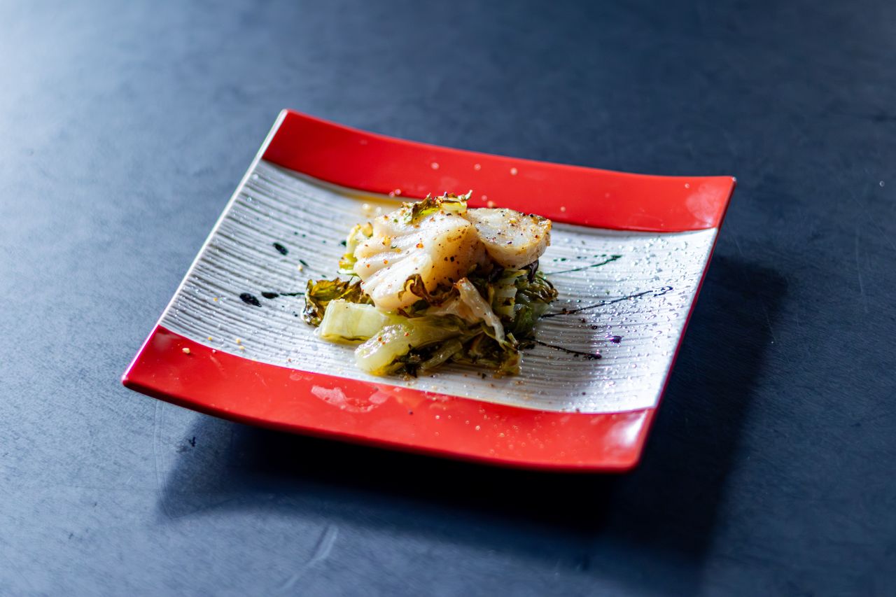 あっさりとした鱈。アンチョビと和えた白菜を添えて。日本酒にもよく合います。