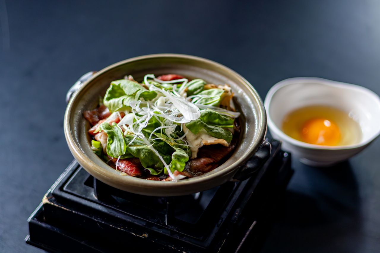 能登牛を小鍋仕立てで楽しむ一皿。生卵に絡めて、すき焼き風にお楽しみください。
