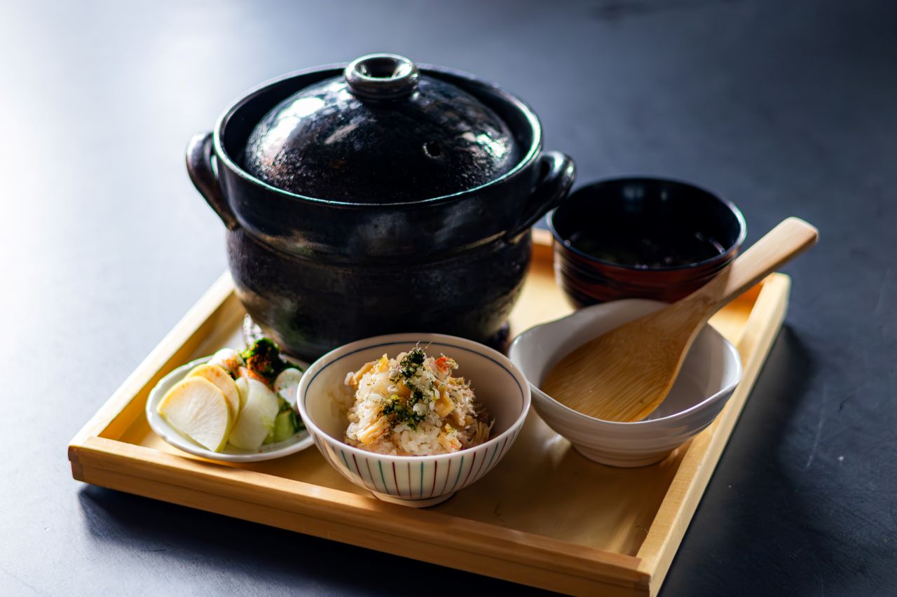 蟹と干し貝柱のうまみがたっぷりと染みたご飯。炊きたてで提供します。