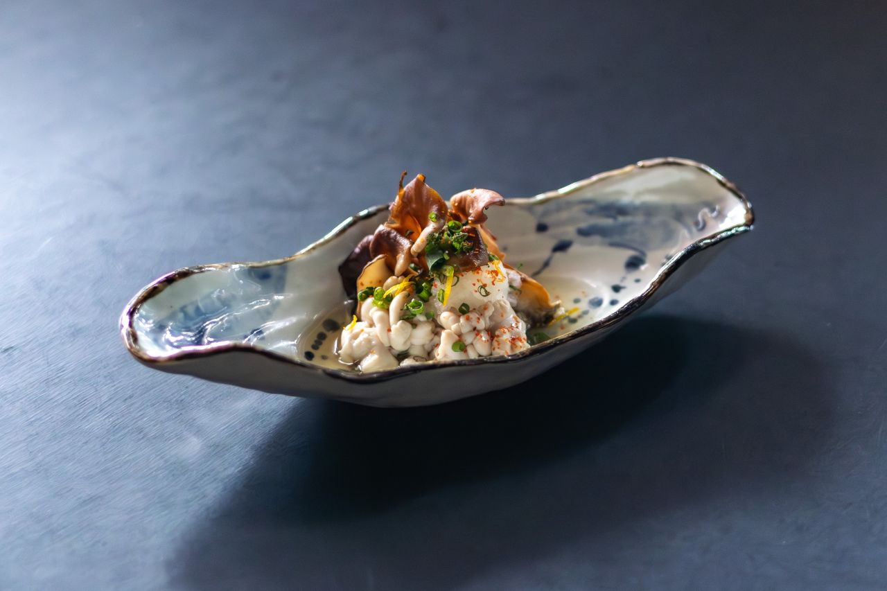 ■鱈白子と焼き舞茸のおひたし 鬼おろし、刻み柚子、一味、ねぎ