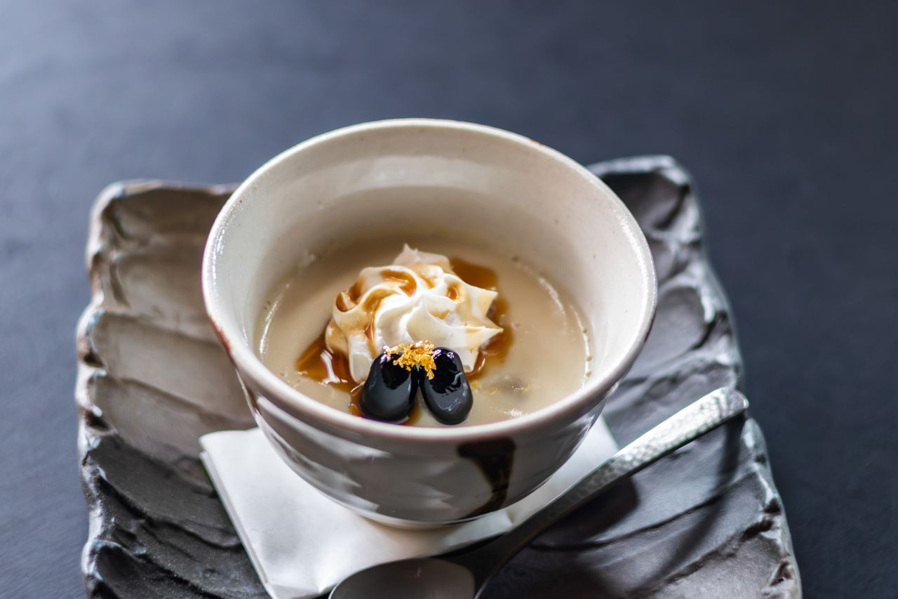 ねっとりとした焼き芋が入った、コクのある自家製プリン。