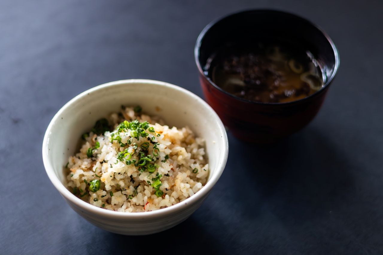 〆の食事はこの時期ならではの蟹めしで。蟹の風味をたっぷりと楽しめます。